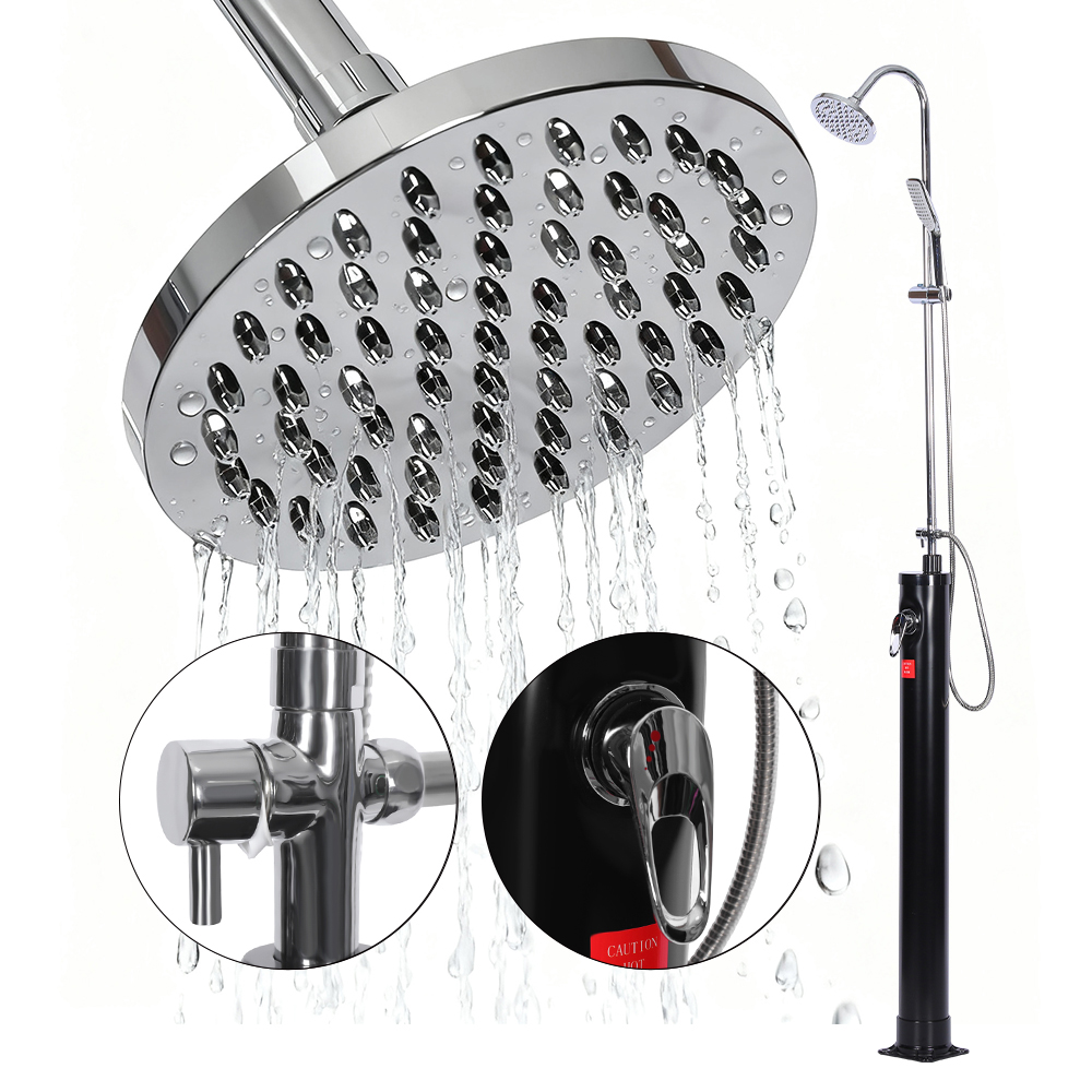 Solárna stĺpová sprcha pre vonkajší záhradný bazén LY08L03 8L je vybavená jednopákovou batériou, ktorá presne reguluje teplotu vody zmiešaním teplej vody zo sprchového potrubia so studenou vodou zo záhradnej hadice. Je vybavená prípojkou na záhradnú hadicu pre pohodlné plnenie a vypúšťacou zátkou, ktorá umožňuje úplné vypustenie vody pre bezpečné zimné uskladnenie. Sprcha je postavená na pevnom nerezovom podstavci kvôli stabilite, jednotlivé časti sprchy sú bezpečne pripevnené skrutkami a pre bezpečné používanie musí byť ukotvená k zemi. Návod na obsluhu je súčasťou dodávky a je dostupný vo viacerých jazykoch.