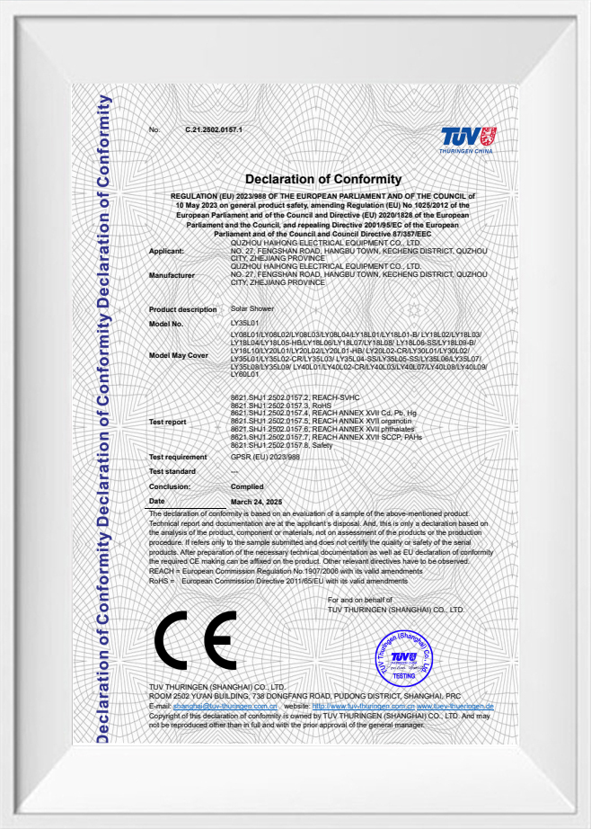 Pre majiteľov domov so súkromnými oázami inštalácia a Bazén solárna sprcha je najúčinnejšou stratégiou na udržanie nedotknutej kvality vody. Quzhou Haihong Electrical Equipment Co., Ltd. , založená v roku 2010 v Zhejiang, Čína, venovala viac ako 15 rokov skúseností dizajnu a výrobe týchto inovatívnych systémov. Chápeme, že opláchnutie pred vstupom do bazéna nie je len o pohodlí, ale aj o hygiene. Vedecké štúdie ukazujú, že rýchle opláchnutie pred kúpaním odstráni až 90 % organických nečistôt, ako je pot, kožné oleje a kozmetika. Tento postup zaisťuje, že bazén zostane krištáľovo čistý a drasticky znižuje zaťaženie filtračných systémov a potrebu drsného chemického ošetrenia.